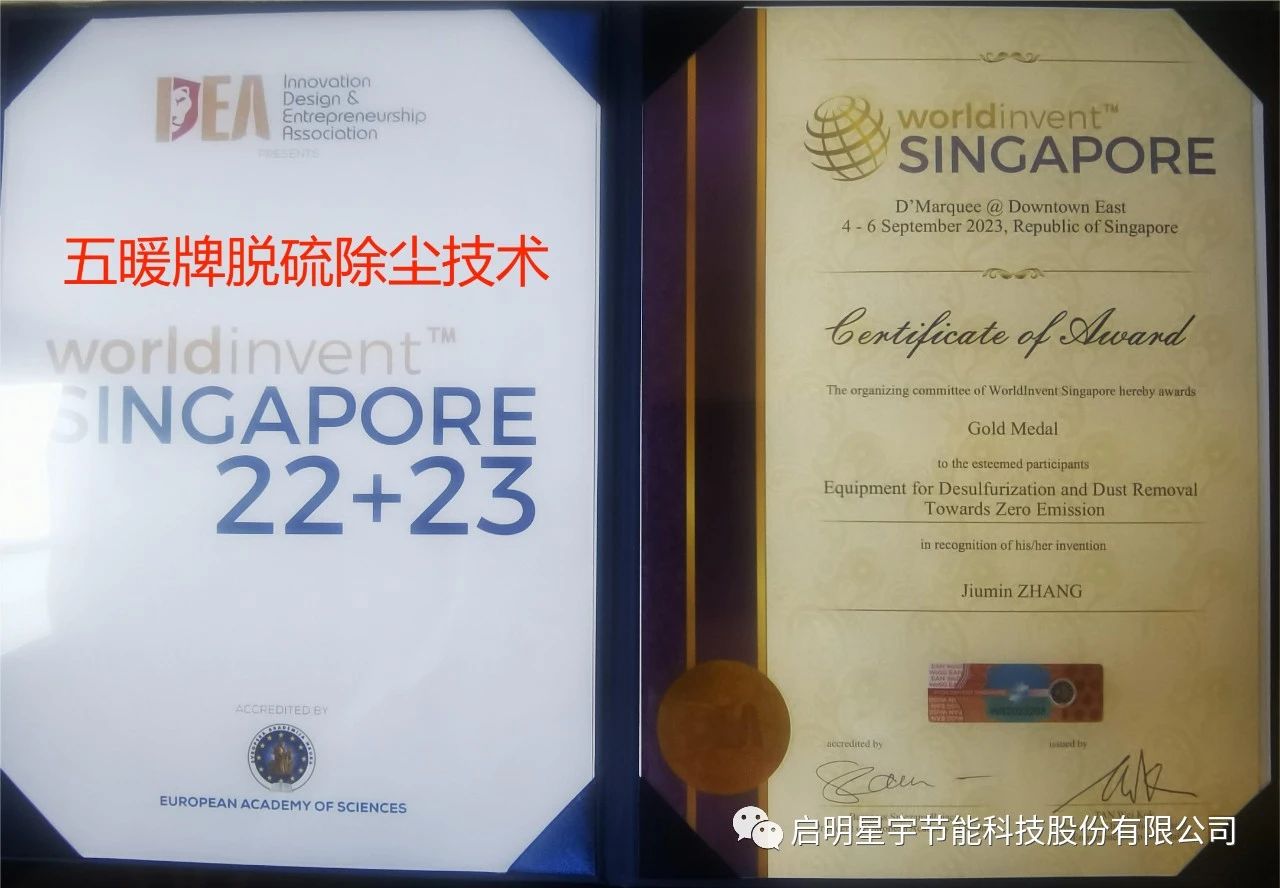 2023年9月新加坡國際發(fā)明展覽會,授予五暖牌脫硫除塵脫硝一體化設(shè)備《全球原創(chuàng)發(fā)明獎》,是對啟明星宇10年研發(fā)成果的肯定,同時(shí),體現(xiàn)出為全人類服務(wù)的能力和價(jià)值,專利技術(shù)轉(zhuǎn)化產(chǎn)品,全球原創(chuàng)唯一性,企業(yè)品牌得到進(jìn)一步提升!